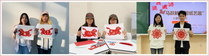 在实践体验环节,师生们热情高涨,纷纷拿起剪刀和红纸,跟随两位老师学习折叠、起剪、镂空等技巧。大家专注创作、相互交流,在指尖的翻飞中感受剪纸艺术的独特魅力。不少同学发挥创意,在骏马纹样基础上融入新春祝福、校园元素等内容,创作出独具个性的剪纸作品。活动尾声,师生们展示着自己的作品,脸上洋溢着满满的成就感。