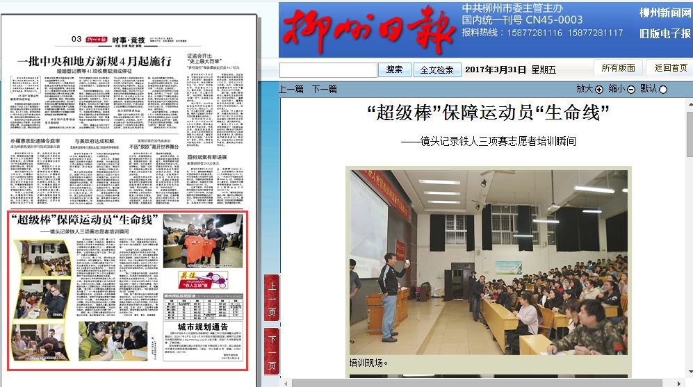 《柳州日报》以半个版面来报道beat365官网铁人三项赛志愿者培训开展情况