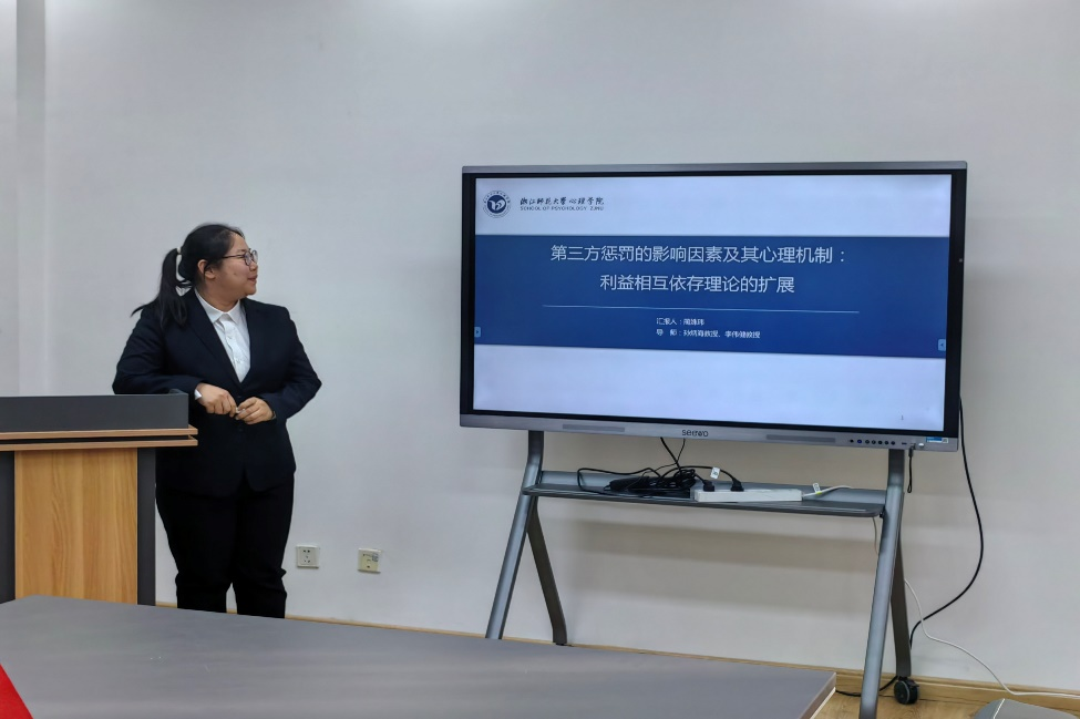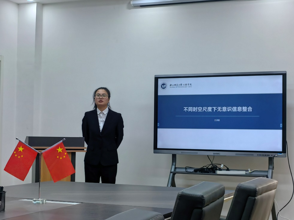 交流会上,来自浙江大学的杨西玛博士、浙江师范大学的蔺姝玮博士、万思敏博士分别作了《科研成果分享与交流》《第三方惩罚的影响因素及其心理机制:利益相互依存理论的扩展》《不同时空尺度下无意识信息整合》的学术报告。在互动环节中,三位青年博士与必赢官网博士生展开了热烈讨论,并就在场博士生的提问进行了详细解答,现场气氛融洽和谐。会议最后,金童林副院长对三位青年博士的精彩报告作了简单总结,讲座在热烈的掌声中圆满结束。