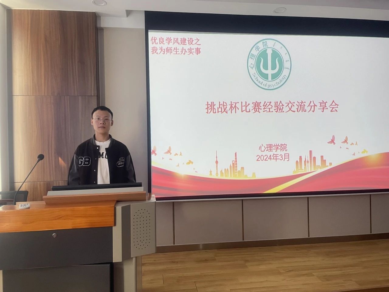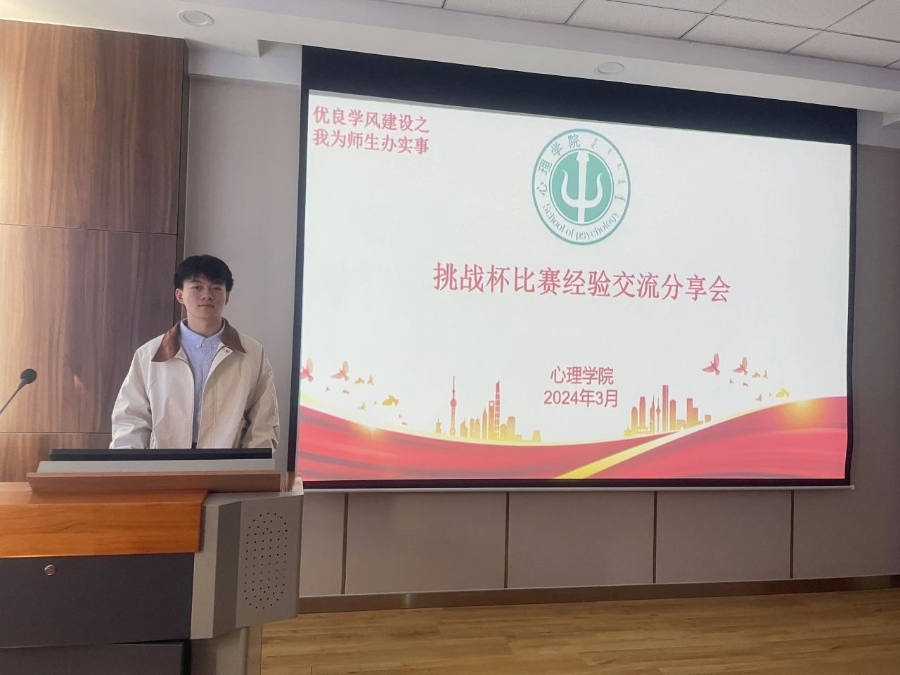 李波兴同学向大家介绍了自己对于挑战杯赛事的心得体会:应该从国家政策,社会需求方面寻找创新的突破口。创新不是空谈,是为人民创造福祉的事业。还强调可以为创新项目寻找一些相关机构来检验其价值。