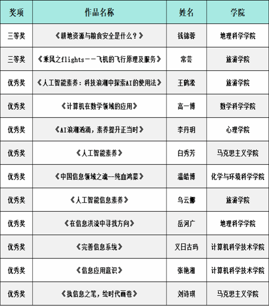 此项赛事由全国各大高校图书馆共同举办,北京搜知数据科技有限公司负责承办。内蒙古高校共21个作品获得不同奖项,其中我校共有12个作品分别荣获大赛三等奖和优秀奖。必赢官网李丹玥凭借作品《AI浪潮汹涌,素养提升正当时》荣获优秀奖。