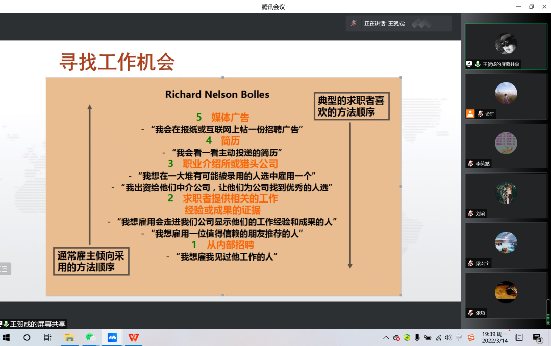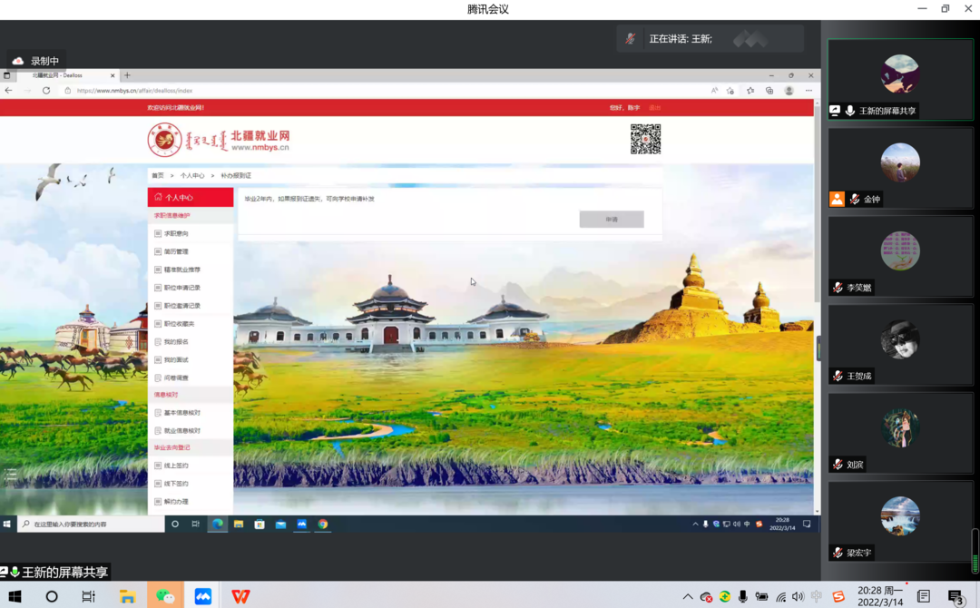 为贯彻党中央、国务院“稳就业”“保就业”决策部署,落实学校就业工作要求,推进必赢官网2022届毕业生就业工作,促进毕业生高质量就业,必赢242net官网于2022年3月14日晚特邀请我校招生就业处就业市场部部长刘在青、招生就业处职业发展指导中心主任王贺成、招生就业处就业信息服务中心王新三位老师开展线上就业政策讲座,必赢官网党委书记七十三、院长乌云特娜、副院长侯友、全院教师及2022届毕业生参加讲座,讲座由学院党委副书记副院长张晓阳主持。
