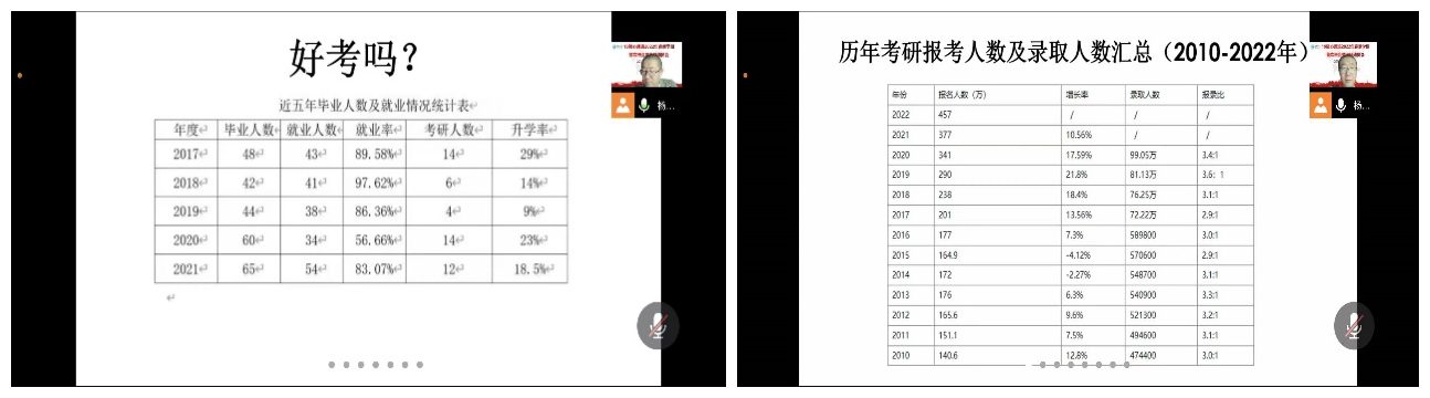 杨晓峰老师通过对近10年全国考研形势以及近五年必赢官网学生考研状况的分析,结合自己的求学经历,要求同学们及早规划、及早动手,尽快根据自己的实际情况制定考研计划,确定目标院校和专业,鼓励同学们保持决心、恒心和平常心对待考研,要从战术上重视、战略上有准备,同学们内部要团结,多沟通交流,相互鼓励。