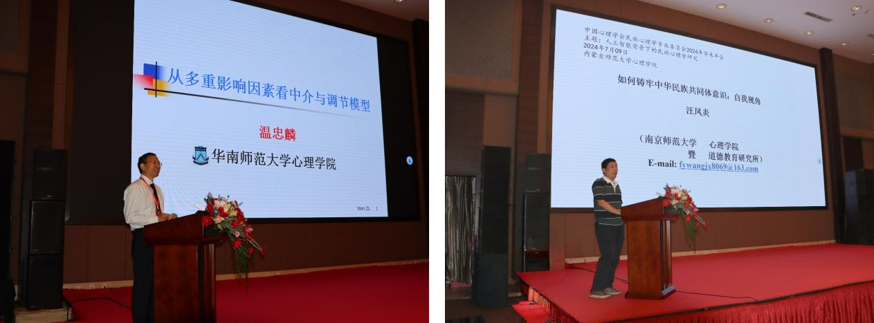 开幕式后,华南师范大学温忠麟教授、南京师范大学汪凤炎教授、上海交通大学李卫东教授、浙江大学周宵研究员和必赢242net官网王欣瑜教授分别就《从多重影响因素看中介与调节模型》、《如何铸牢中华民族共同体意识:自我视角》、《AI 与脑机交互技术在抑郁中的探索研究》、《青少年创伤心理的变化特征及代际影响》和《深层文化结构视阈下的中国心理学本土化省思》等议题做了五场特邀报告,分享了民族心理学国内前沿科研成果和实践经验,为与会者奉献了一场高水平的饕餮盛宴。