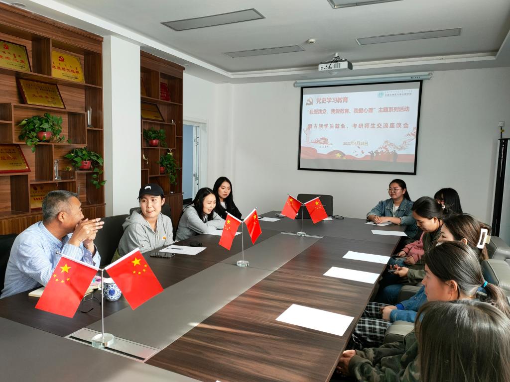 为扎实开展党史学习教育、推进“我为群众办实事”实践活动,贯彻落实党中央、国务院“稳就业”、“保就业”决策部署,积极推进必赢官网毕业生高质量就业,促进教育高质量发展,4月14日下午,必赢242net官网党总支在学院楼B213会议室开展“我爱我党、我爱教育、我爱心理”党史学习教育主题实践活动——召开蒙古族学生就业、考研师生交流座谈会。党总支书记七十三、副书记张晓阳、学就办主任张金钟与2017级、2018级心理学专业学生进行交流座谈。