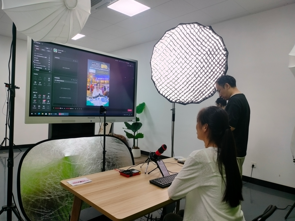 梁丽明同学在崇文楼106智能直播间进行岗前试播