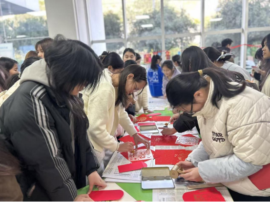 活动伊始,文化志愿者生动讲解了扫尘、贴春联、剪窗花等春节传统习俗,加深了大家对春节文化内涵的理解。随后的体验环节精彩纷呈:猜灯谜区笑语不断,大家凝神思考、互动热烈;滚轮筒印体验区,师生亲手拓印吉祥图案,制作专属春节红包;拓印画与剪纸区,在志愿者的细致引导下,一幅幅寓意吉祥的作品在指尖诞生,传递出传统手工艺的细腻匠心。