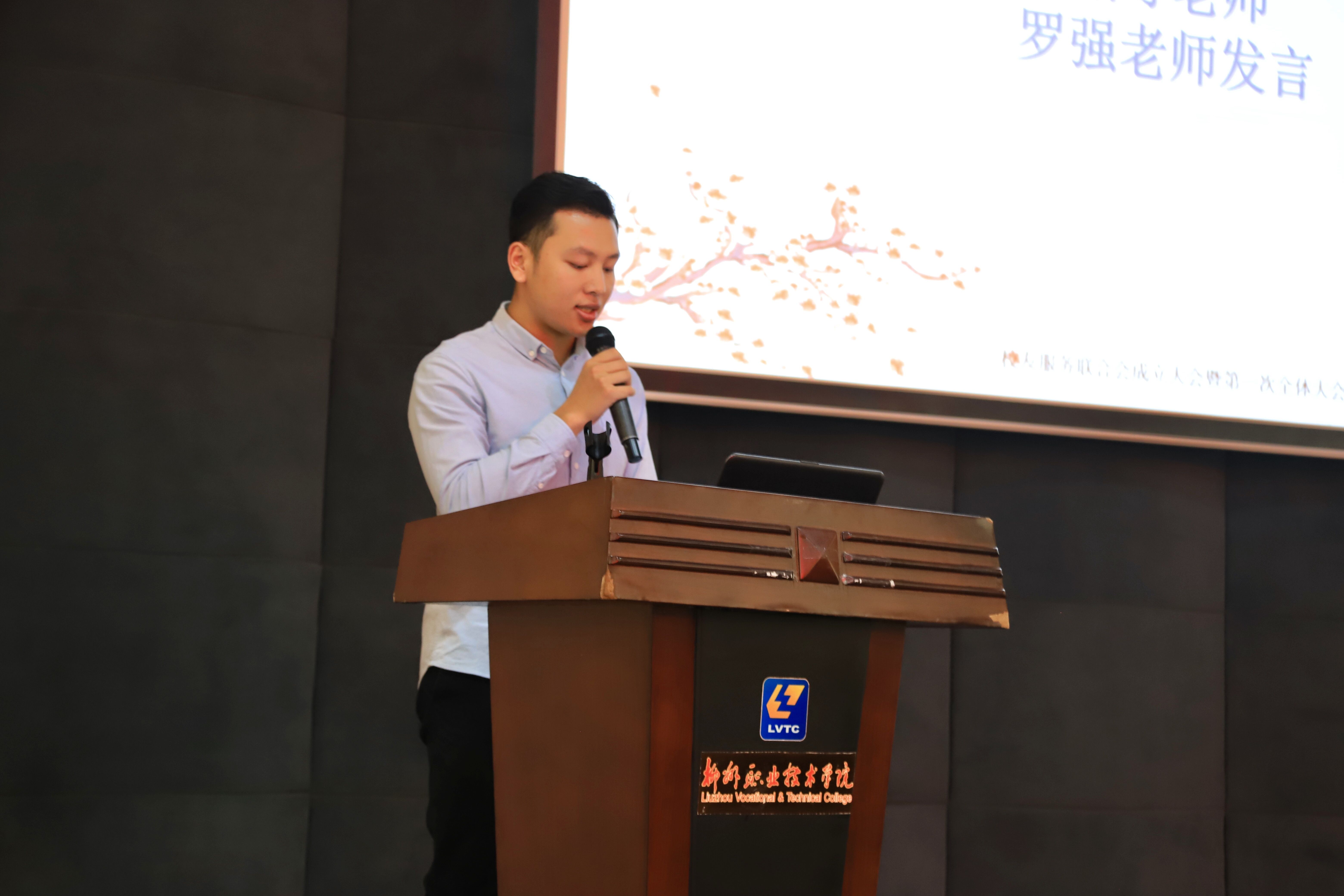 会上,罗强老师仔细讲解了校友服务联合会的主要任务,讲述了成立校友服务联合会的重要意义。表示要建设和完善好这个“服务平台”,充分发挥“服务平台”的作用!不断完善校友服务联合会制度建设。他坚信校友服务联合会的成立必将为学校和校友,校友和校友搭建沟通、交流联络、相互扶持、互通有无、携手共进的平台,也相信校友服务联合会与柳职院的未来更加美好。会上,罗强老师还给首届理事和干事讲述了学校的历史和未来的发展以及校友服务联合会未来发展的规划蓝图。本届会长盘育宏同学表示:校友服务联合会在校友办公室的指导下,以今日成立为开端,携手校友,叙友情、话相知、谋发展,携手并进,共创柳职辉煌。