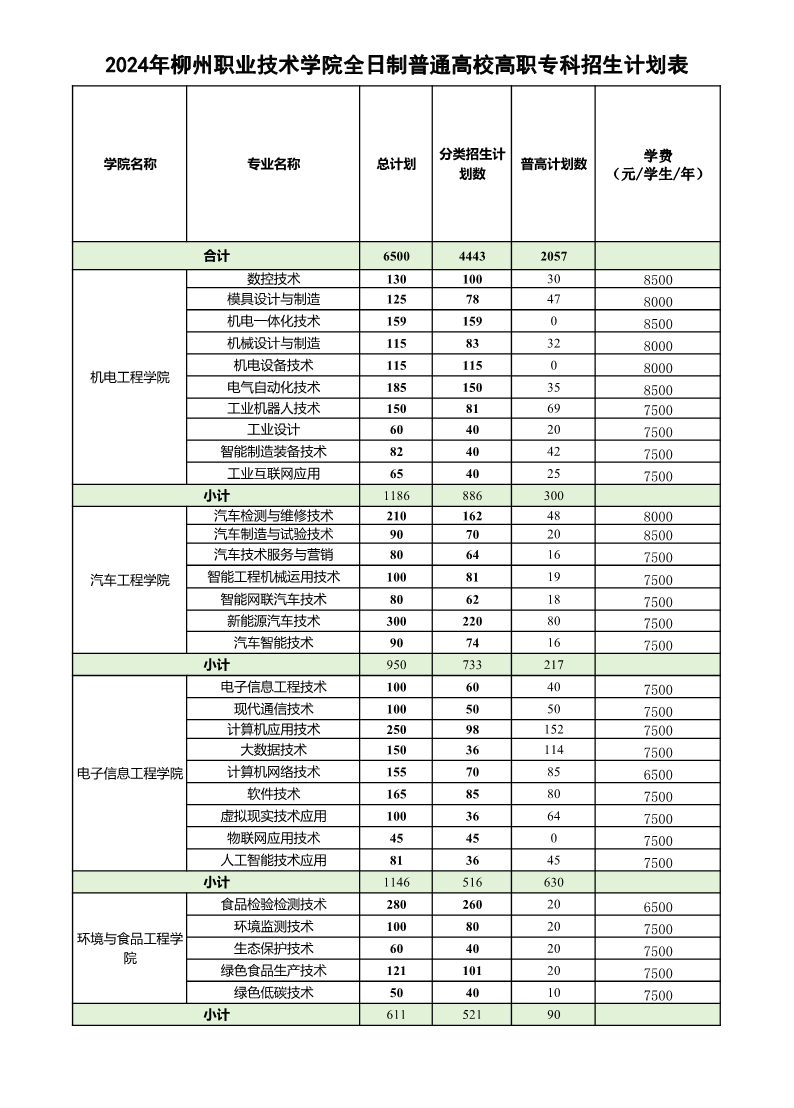 2024年柳州职业技术学院全日制普通高校高职专科招生计划表